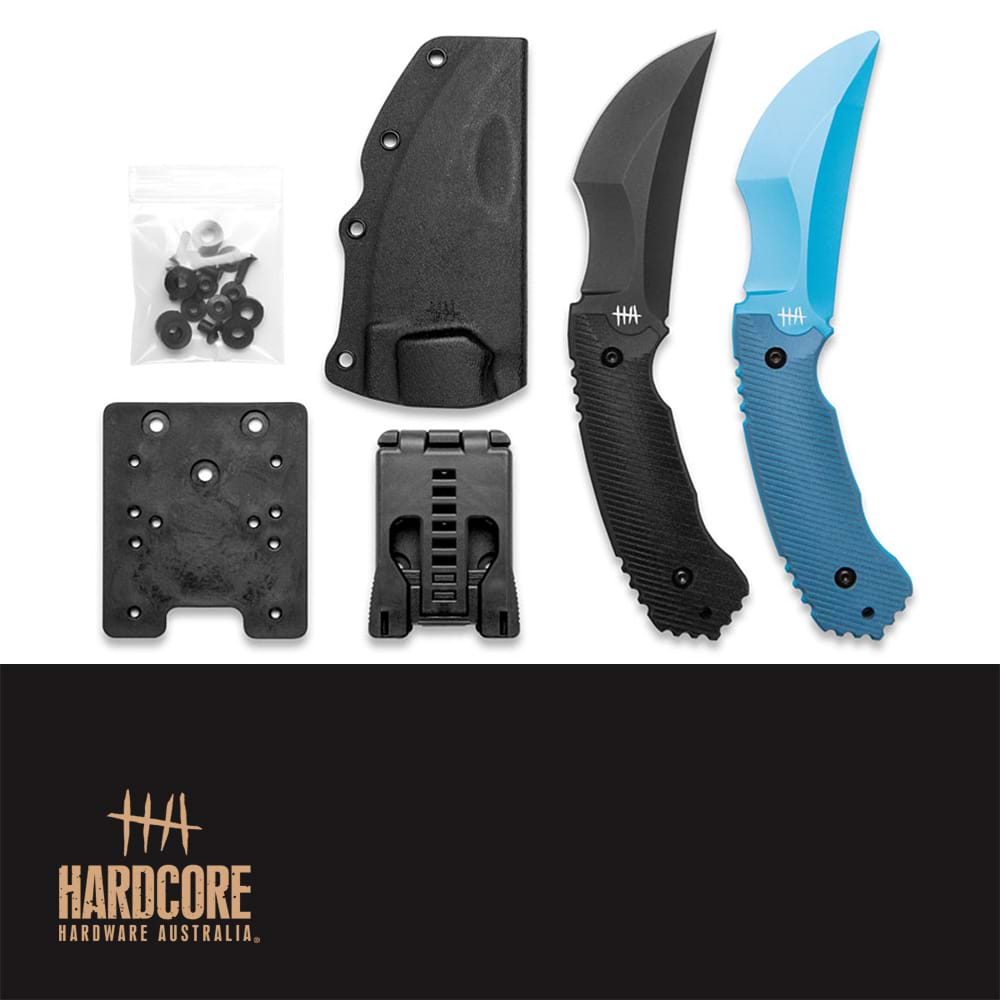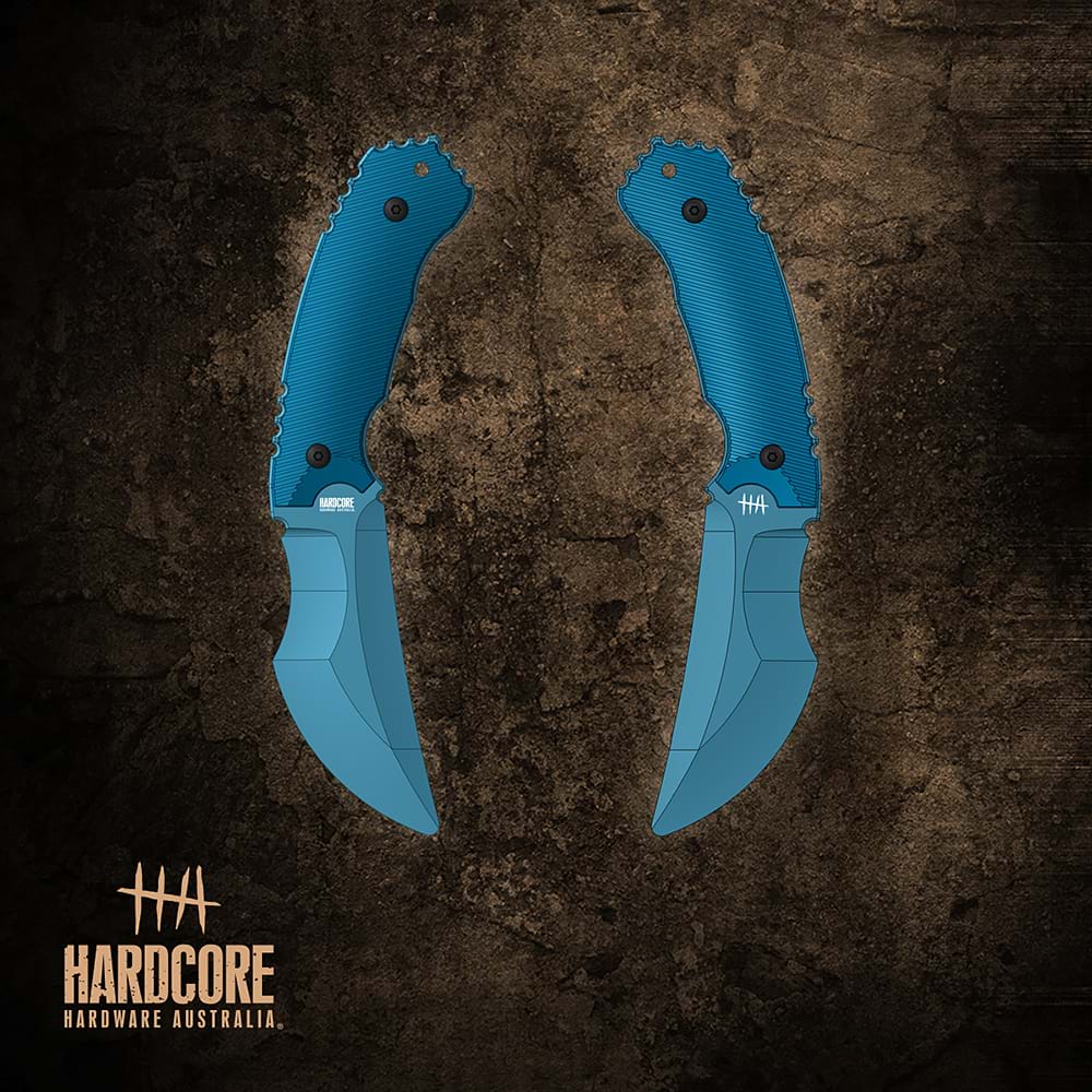 The Hardcore Hardware Australia® RAZORBACK CQB-01 Bundle Package includes a live edge RAZORBACK with sheath and a RAZORBACK Trainer in HIVIS blue.